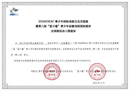 此次“IDEAC戏剧教育实践基地”的授牌与E-Wings的精彩展演,是临平职高英语戏剧教育“教”与“学”双向奔赴的生动成果。未来,临平职高将以实践基地为新起点,继续深耕课程建设、丰富实践平台、强化师资培育,让英语戏剧教育真正成为滋养学生全面发展的沃土,助力更多孩子在语言运用与戏剧演绎的碰撞中,收获共情力、创造力与团队精神,绽放独特光彩。(杭州市临平职业高级中学)
