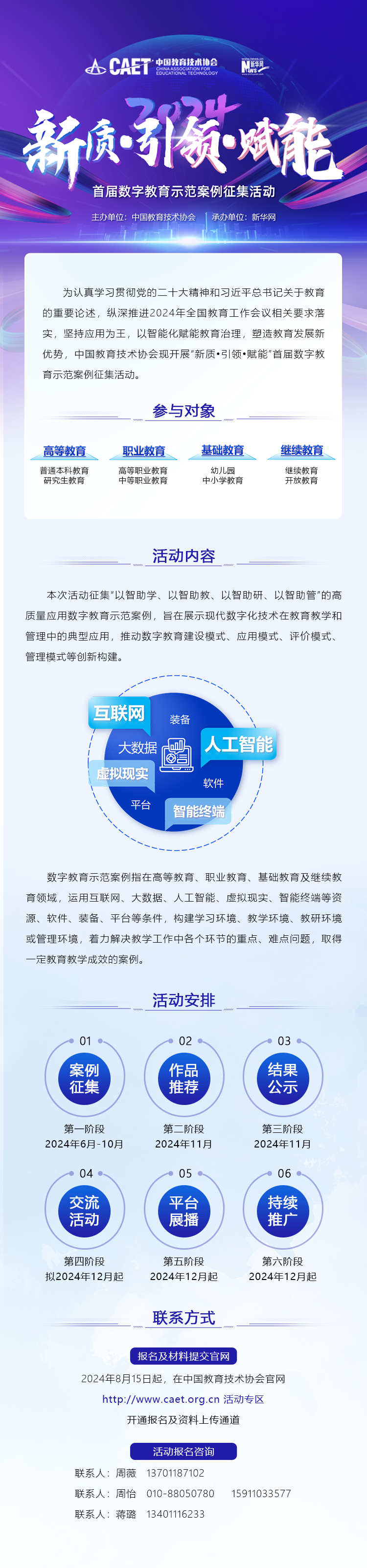 新华网北京8月20日电 为认真学习贯彻党的二十大精神和习近平总书记关于教育的重要论述,纵深推进2024年全国教育工作会议相关要求落实,坚持应用为王,以智能化赋能教育治理,塑造教育发展新优势,由中国教育技术协会主办、新华网承办的“新质·引领·赋能”首届数字教育示范案例征集活动,于2024年8月20日正式开通线上报名通道。